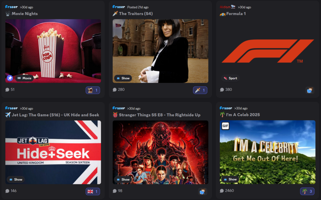 We LOVE watching shows and movies together. Since the introduction of movie nights and the shows and movies discussions area, we’ve watched incredible content ranging from I’m A Celebrity, to Formula 1, to Disney classics!