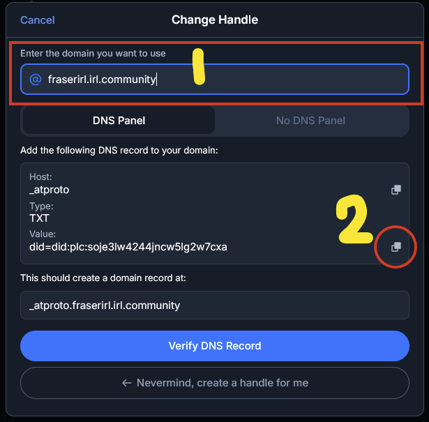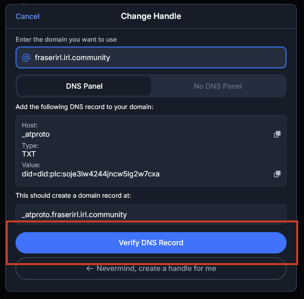 After the success message, simply click on “Verify DNS Record” on the Bluesky page!